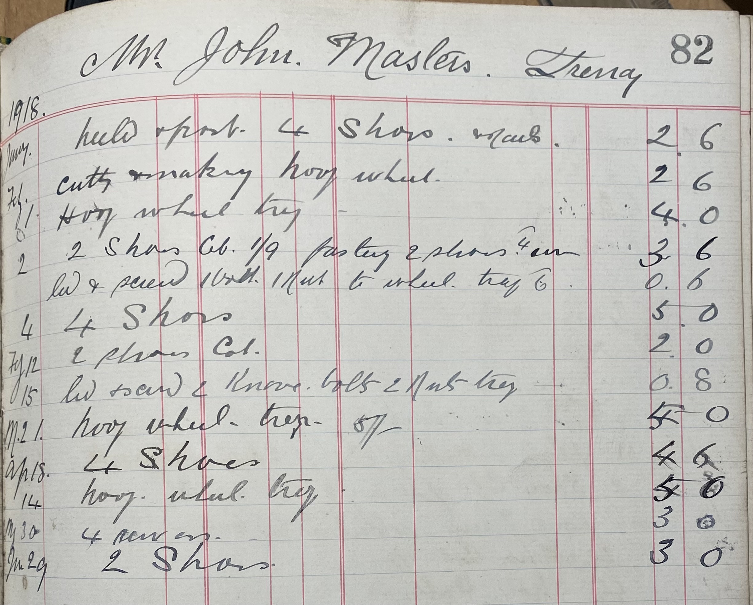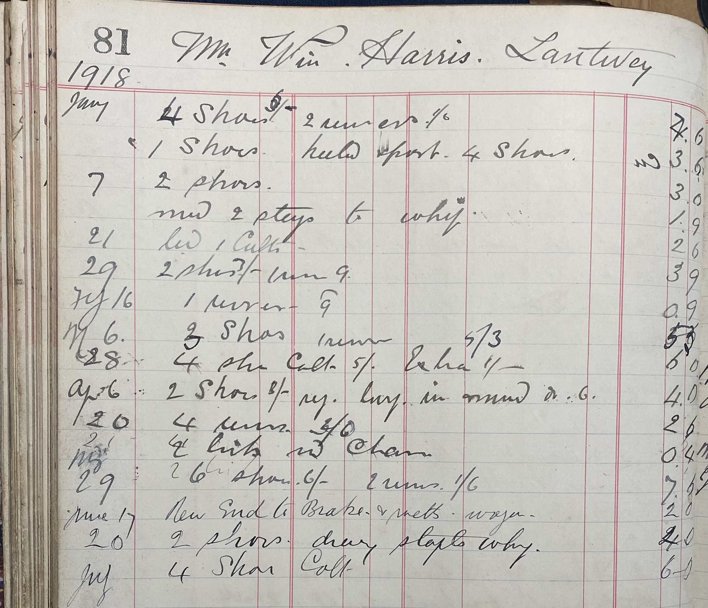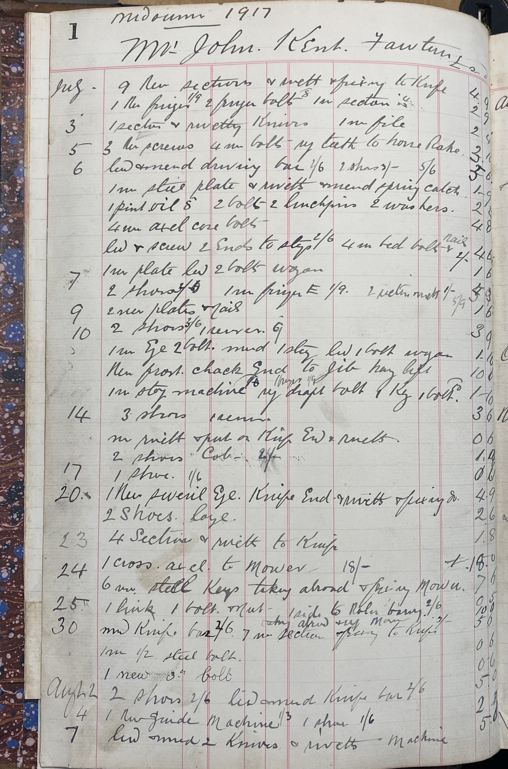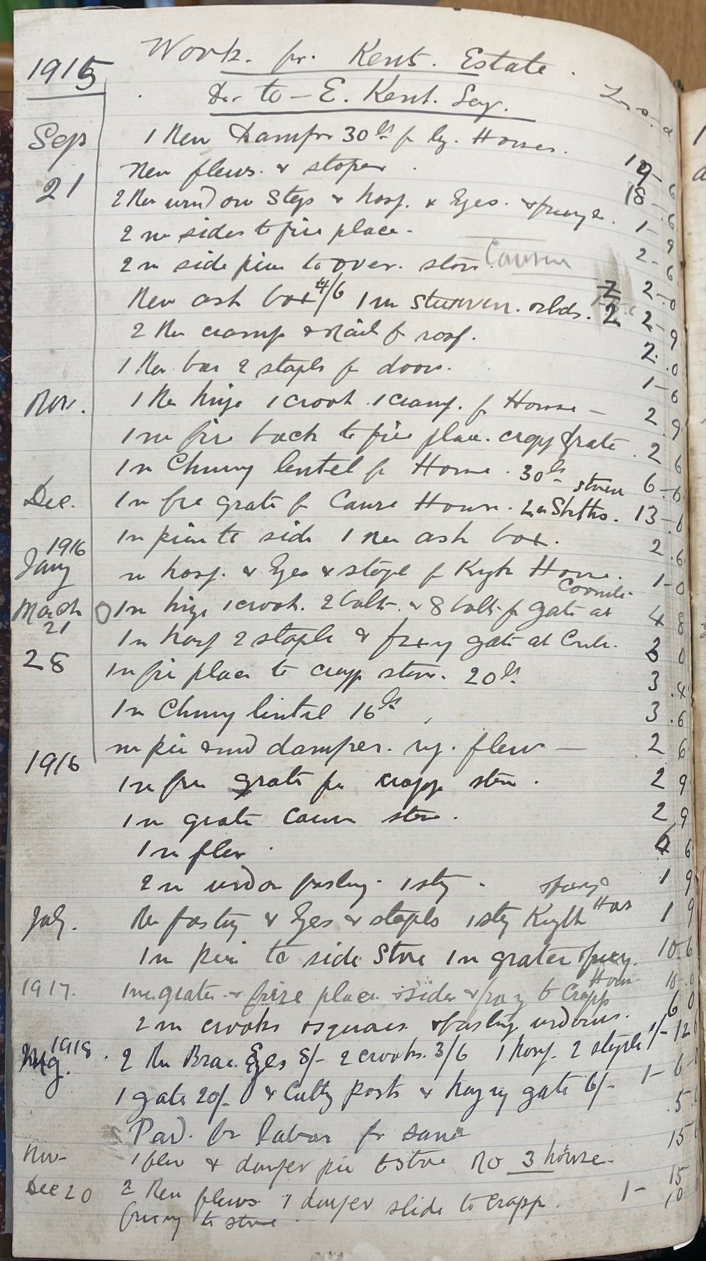This large Blacksmith's Ledger records accounting and work carried out by the Kent Blacksmith from 1914 to 1925 covering work undertaken during the First World War and into the mid 1920's.