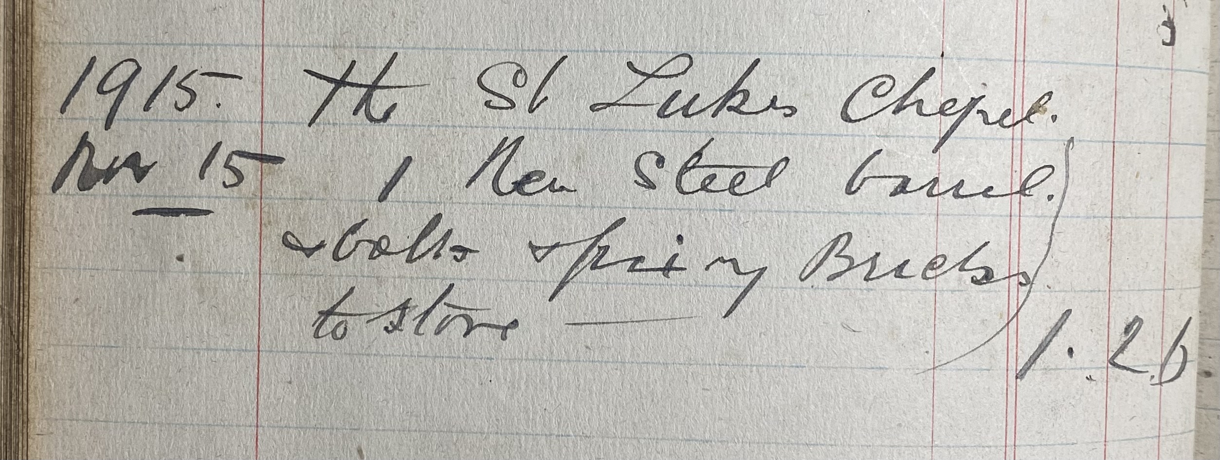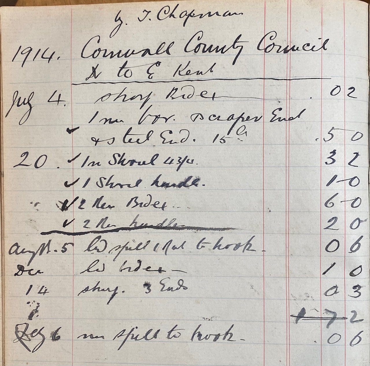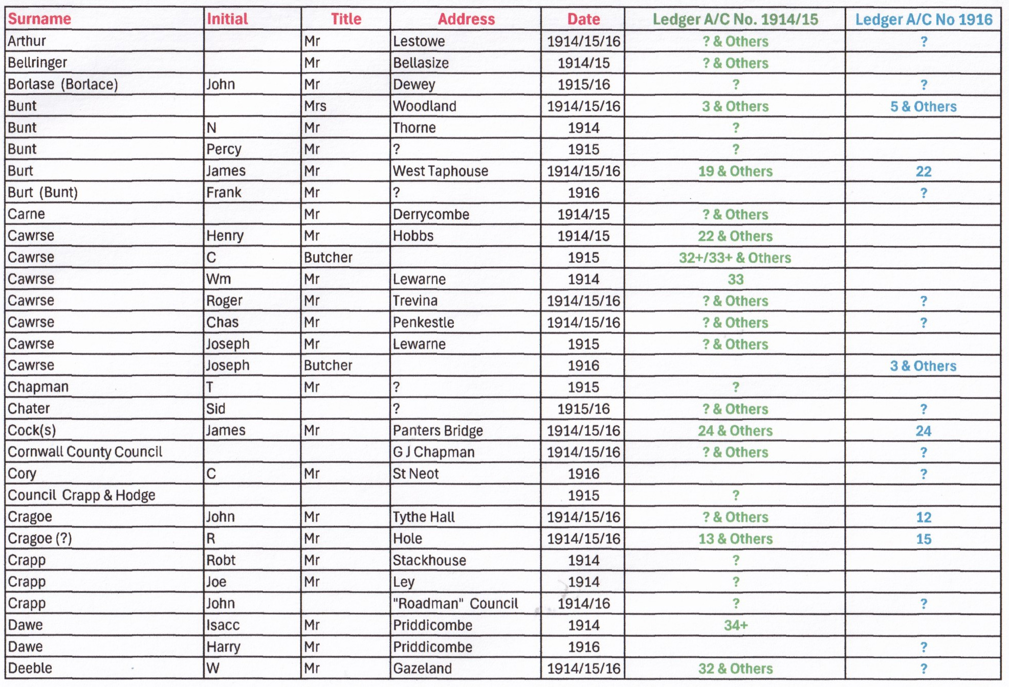 There are seven columns in the chart, Surname, Initial, Title, Address and Date, these five columns are in RED. The next column, Ledger A/C No. 1914/15, in GREEN, records the 1914 and 1915 entries.
