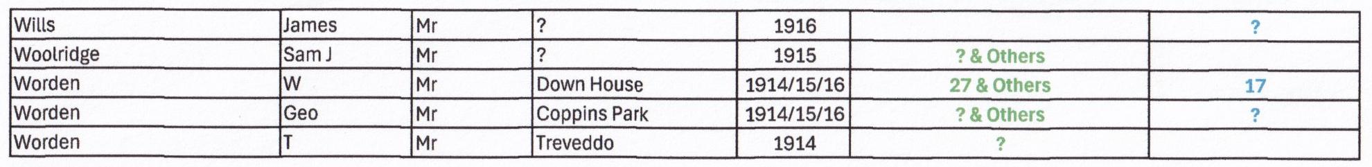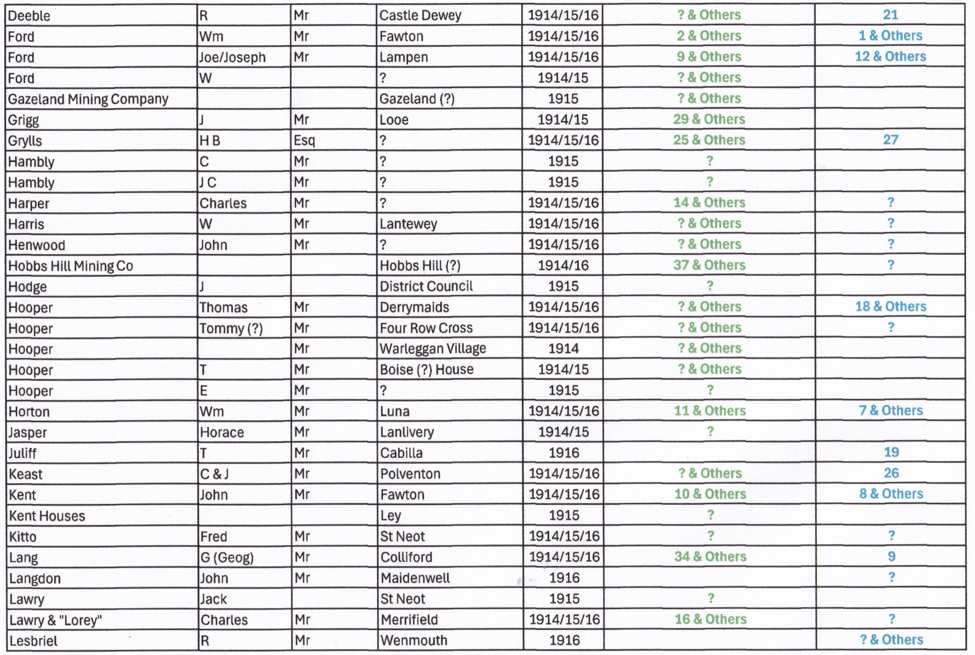 In the last column entries appear in BLUE “Ledger A/C No 1916. Again some entries are numbered but only from 1 to 27. If there is a “?” in the column it indicates that the entry is after number 27. If there are multiple records you will see “& Others” written.