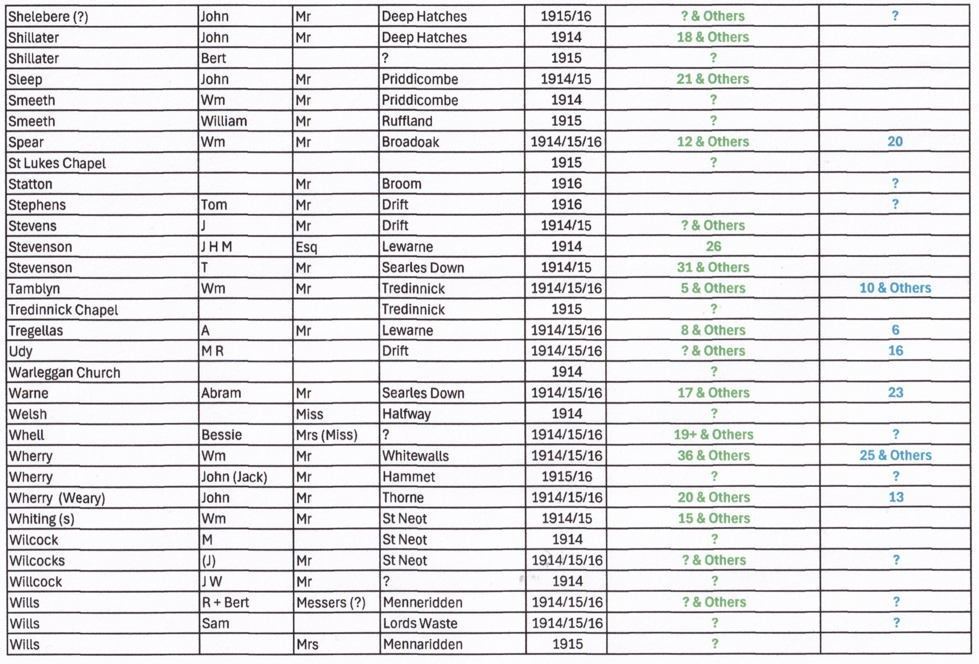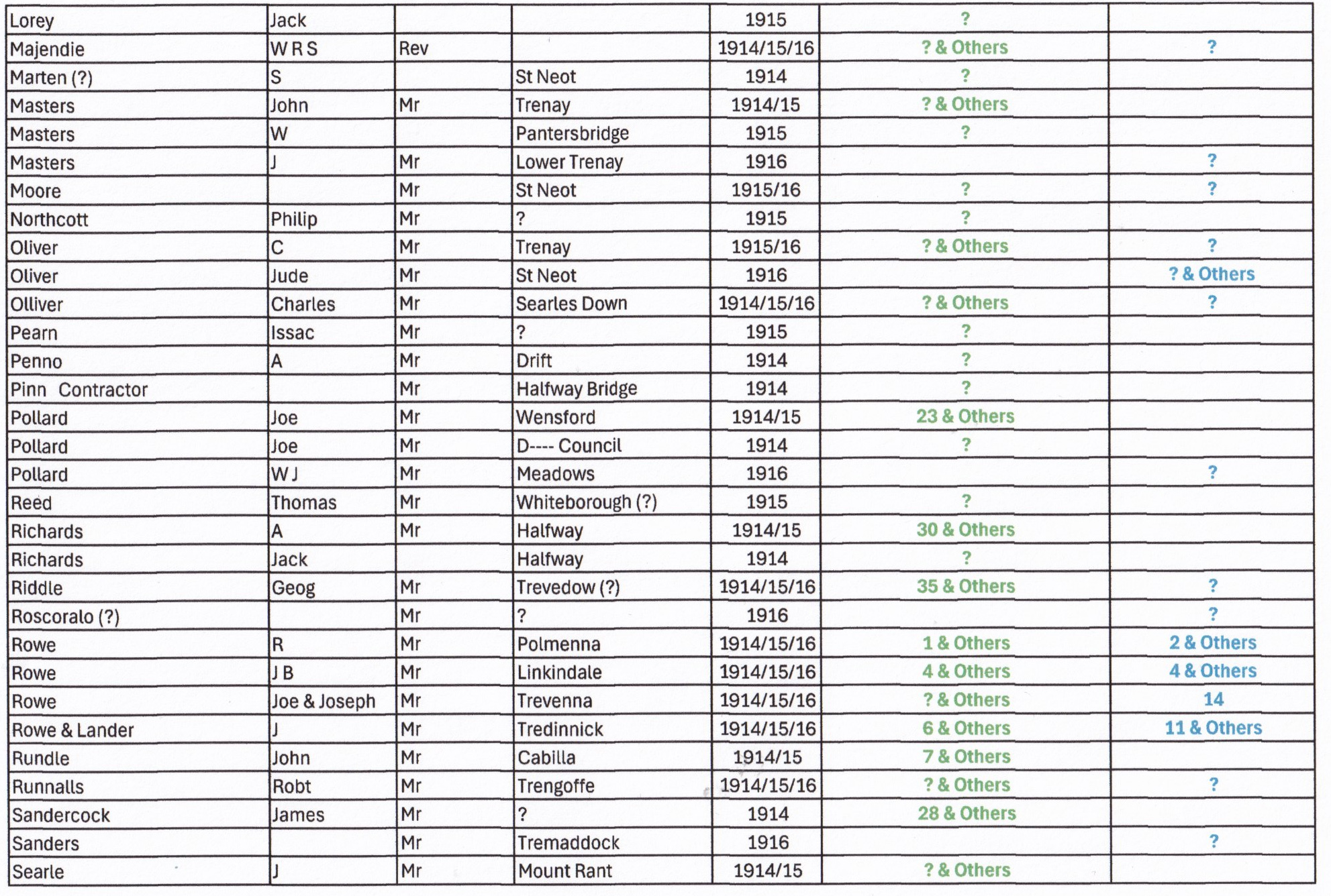 Transposed by Mim McCormack 2025. If your Family name appears on this list and they were resident in St Neot at the time of the Ledger contact us to view the appropriate Ledger. Good luck with researching and meeting your Ancestors!