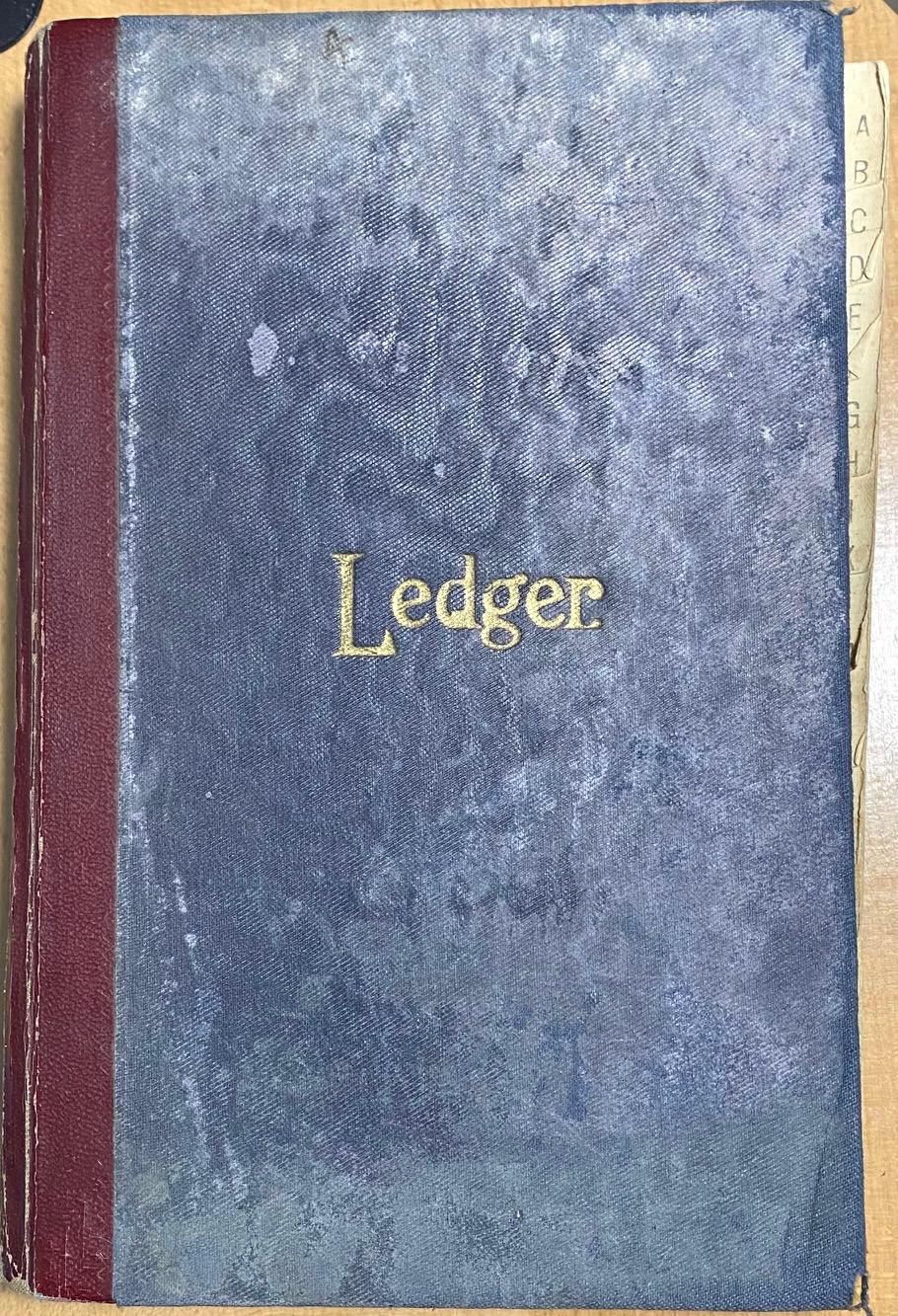 The Ledger, pictured on the front cover, measurers 23.5cm x 15.5cm is mid-grey in colour with a maroon spine. “Ledger” is written in gold lettering in the center of the front cover.