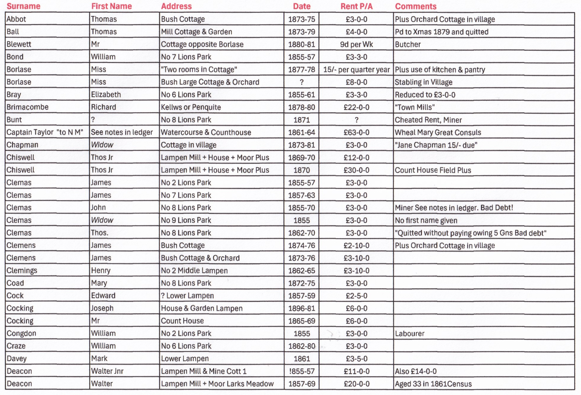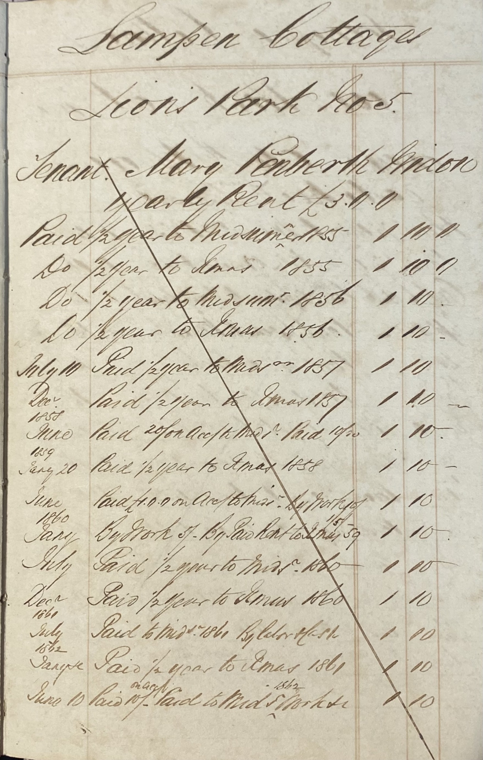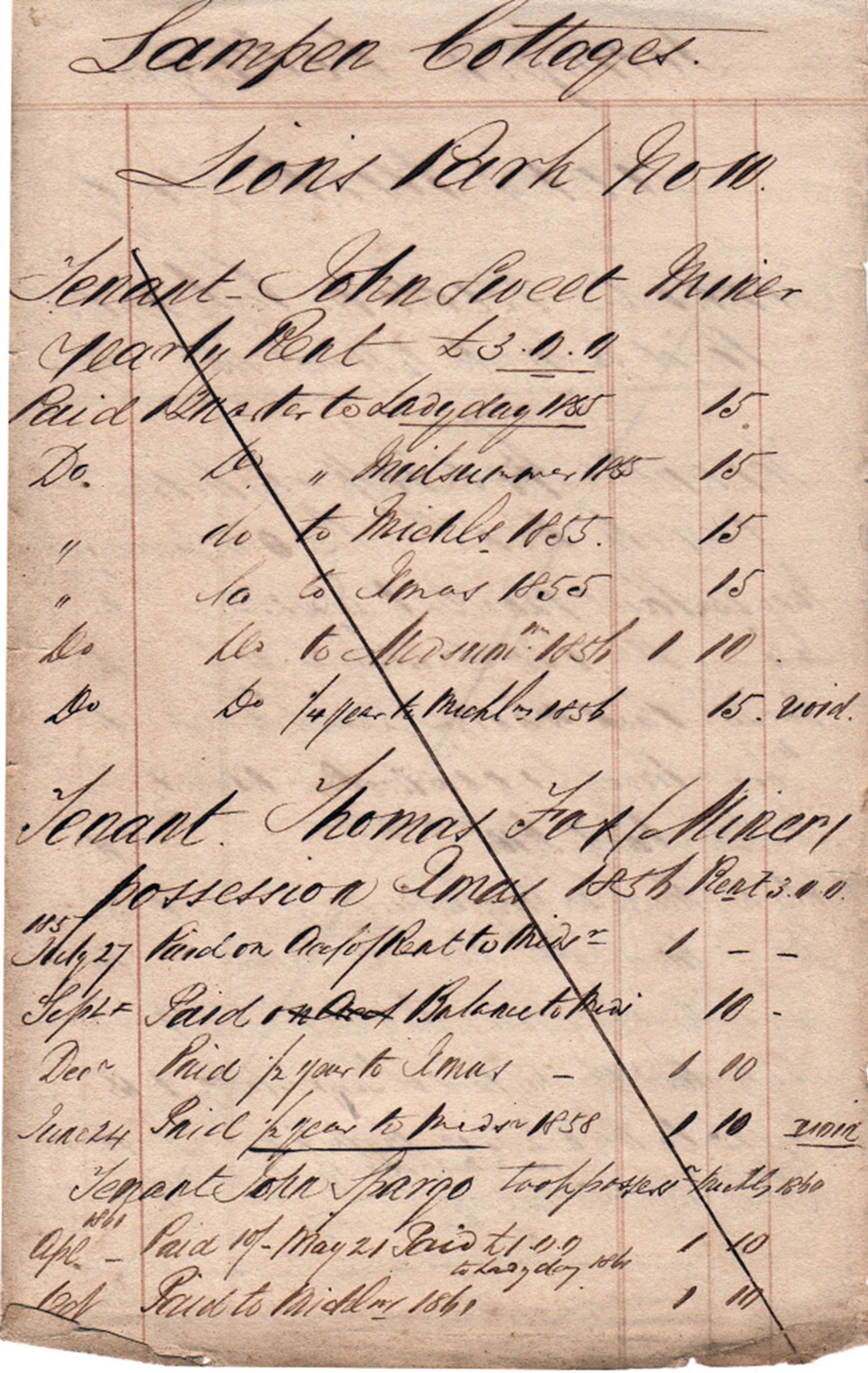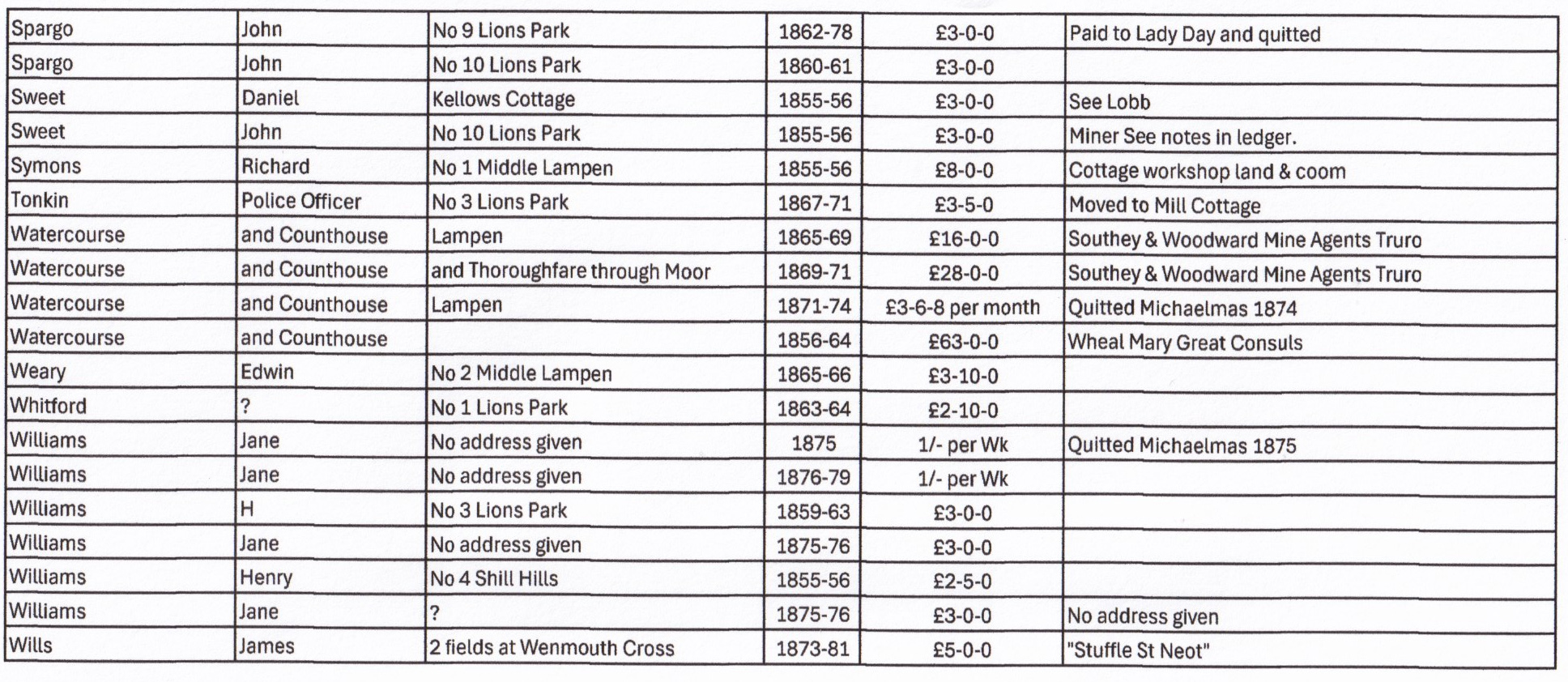 A small account book detailing rent paid, houses occupied and dates when identified people were resident in St Neot. Most entries date from 1855 but there are a couple of earlier ones. There is mention of Miners and Mining Companies. An early record of the Policeman is mentioned.